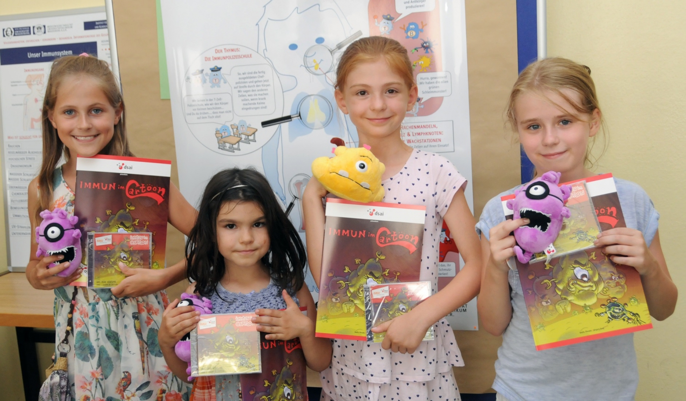 Impressions of the campus holiday for kids by the CRC 854. On July the 5th and 12th 2018, science-hungry young researchers discovered the world of immune cells. They had lots of fun competing in the immune cell quiz, making buttons, isolating DNA from strawberries and visiting a working research lab. PhD students and staff members of the SFB demonstrated the world of the immune system to the junior researchers. Additionally, all children could take home comics, audio books and cuddly toys by the dsai e.V.. These will hopefully encourage our visitors to learn more about the wonderful world of the immune system at home!